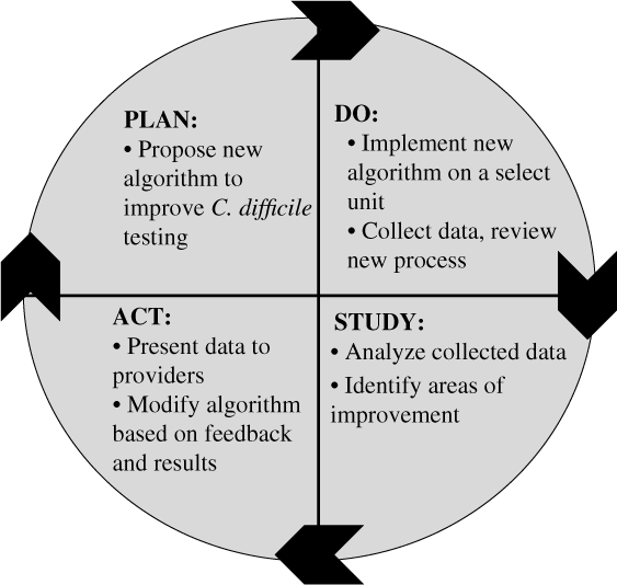 When sufficient resources are available, nurses can partner with other clinicians in identifying additional targeted interventions that may be necessary to improve diagnostic testing or antibiotic use. The Plan-Do-Study-Act (PDSA)Reference Deming30 framework for quality improvement can be considered a guide to implement such interventions (Fig. 1). For example, it can be used to implement an intervention to improve C. difficile testing: