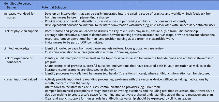 Table 1. Perceived Barriers to Antibiotic Stewardship (AS) by Acute-Care Nurses and Potential Solutions