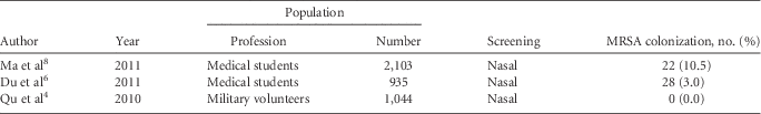 TABLE 1 Characteristics and Results of Studies That Investigated Methicillin-Resistant Staphylococcus aureus (MRSA) Colonization Among Healthy Chinese Individuals