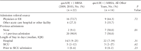 Due to the observed significant trends, we evaluated the data regarding admission source (ie, referred by physician, emergency room (ER), or another facility or acute care facility), hospital LOS, LOS prior to SICU admission, and rate of hospital admissions (previous 12 months) for patients with qacA/B(+) isolates obtained during 2009–2010 and compared them with all other years. We found no significant difference in the admission source (16 [72.7%] vs 9 [64.3%], P=.72 for admission by physician/ER), hospital stay prior to SICU admission (1 [0–6] vs 0 [0–2], P=.23), or total hospital LOS (14.5 [9–23] vs 22 [7–39], P=.11). However, compared with qacA/B(+) isolates from other study years, the qacA/B(+) isolates from 2009 and 2010 were more likely to have ≥1 hospital admissions in the prior year (20 [90.9%] vs 7 [50.0%]; P=.01) (Table 4).