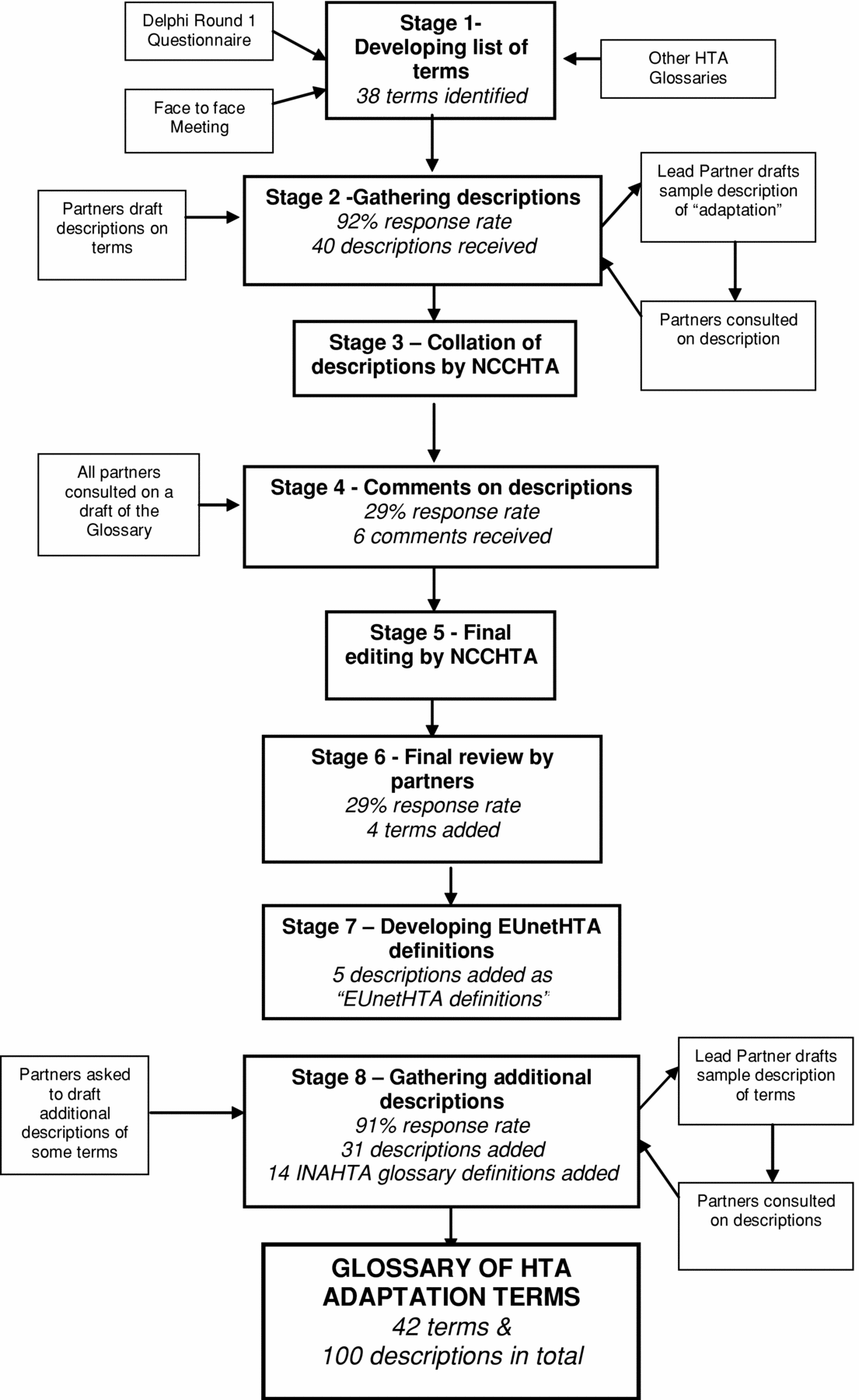 It was decided that additional descriptions should be gathered for the terms that did not have a drafted EUnetHTA definition. This resulted in eleven of the Partners who had already submitted descriptions being allocated a further three glossary terms and asked to write descriptions for these. They were given 4 weeks to draft additional descriptions for the terms they had been allocated. Of the eleven Partners contacted, ten were able to provide descriptions for these terms. Once the new descriptions had been received, they were reviewed by NCCHTA and incorporated into the glossary.