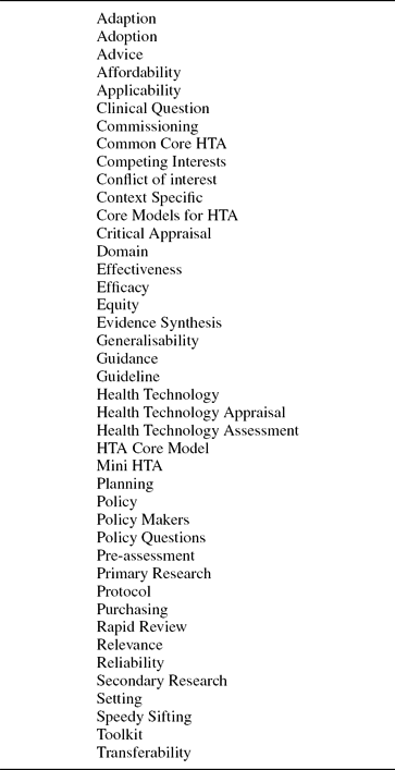 This stage involved identifying terms that would be suitable for inclusion in the glossary. Potential terms were identified from a variety of sources (Reference Chase, Rosten and Turner1), for example, the INAHTA glossary (5;6) and the HTA resource in the National Library of Medicine (9), in addition to the Partners themselves who attended a meeting to discuss the work and who responded to round 1 of a Delphi questionnaire (Reference Chase, Rosten and Turner1;Reference Turner, Chase and Milne10;Reference Turner, Chase and Milne11).