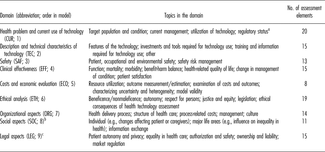 The HTA Core Model was originally developed during the EUnetHTA Project (2006–08), following detailed review of the HTA process, and was expanded and improved further in EUnetHTA Joint Actions 1 (2010–12) and 2 (2012−15) (Reference Kristensen, Lampe and Wild6–Reference Kristensen, Mäkelä and Neikter8). Model applications are available for the assessment of medical/surgical interventions, diagnostic or screening technologies, and pharmaceuticals (10–13). The model has three components: the ontology, methodological guidance on conducting the assessment, and a common reporting structure to standardize outputs. The ontology is designed to guide evidence collection and assessment, by structuring information in nine domains (Table 1). Domains are divided into topics, each of which in turn contains issues of relevance to HTA. Issues are phrased as generic questions and, combined with their respective domain and topic, form an assessment element (10;11).