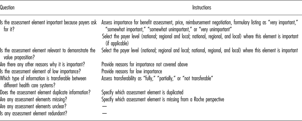 A survey was conducted at Roche in June 2014 to evaluate if the nine-domain model application for pharmaceuticals (version 2.0) was fit for purpose, that is, represented a useful framework for standardized evidence generation and value assessment, from an industry perspective. Usefulness was defined according to the following criteria: (i) Importance to payers: Assessment elements were classified as useful if they met payers’ needs, for example, for benefit assessment in pricing and reimbursement negotiations or formulary listing. The term “payer” was used broadly, to denote national or local payers, reimbursement decision makers or providers of guidance. (ii) Relevance for value proposition: Elements were classified as useful if they contributed, during the initial submission or in the future, to demonstrating and communicating the value of the technology