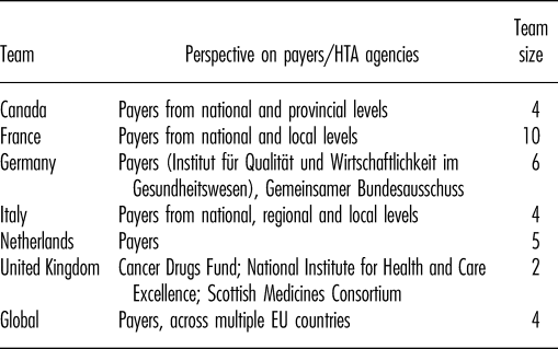The questionnaire was drafted following an initial workshop of the Global Pricing and Market Access (GPMA) team. The draft was piloted with the United Kingdom country affiliate, and the questionnaire revised in line with affiliate feedback. The final questionnaire was shared with country affiliate teams who completed one online questionnaire per team. All country affiliate staff participating in the survey were directly involved in evidence development, reimbursement submissions or payer negotiations for pharmaceuticals, to reflect experiences and needs associated with production and use of HTA within Roche.