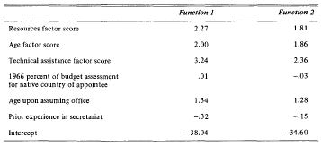 The data on these individuals were collected from the following sources: Who's Who 1974 (London: Adam and Charles Black, 1974)Google Scholar; The International Who's Who, Thirty-Sixth Edition, 1972–1973 (London: Europa Publications Limited, 1972)Google Scholar; The International Year Book and Statesmen's Who's Who 1974 (London: Mercury House Reference Books, 1974)Google Scholar; and International Monetary Fund, Annual Report 1973 (Washington, D.C.: International Monetary Fund, 1973)Google Scholar. These individuals were included in the second group of appointees (which became the 1958–73 group) and the discriminant function analysis program was run again. The coefficients in the functions changed slightly. The new analysis correctly classified thirty-seven out of fifty-two appointees (71 percent, compared with 72 percent for the prior analysis). The Mahalanobis D Square went up slightly to 24.12 (from 19.64). The inclusion of this new data does not seem to make much difference in the general results obtained. Secretary-General Waldheim was the only one of the new appointees who was misclassified. He had a .34 probability of belonging to the second group. The only individual who was reclassified was Eugene Black, who had a new probability of .503 of belonging to the second group.