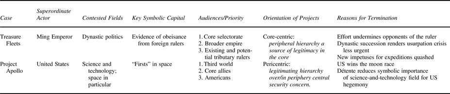 Much hierarchy-centric scholarship makes a critical point: once we shift from assuming anarchy to focusing on patterns of super- and subordination, we need to attenuate—if not abandon—the assumption that relations among states are fundamentally distinctive from relations within them. For example, the absence of a clean distinction between “international anarchy” and “domestic hierarchy” undermines warrants for dismissing the importance of legitimacy and authority in international politics. Theories developed to handle relations among actors in other contexts can be applied to international settings.Footnote 17 Mechanisms and processes that hold within polities may also operate among and across them.Footnote 18 We compare the Apollo program—where interstate concerns involving hegemonic influence and a revisionist power played a key role—to the Ming treasure fleets—where concern involving legitimacy within imperial structures predominated—in part to highlight this implication of hierarchy-centric theory.