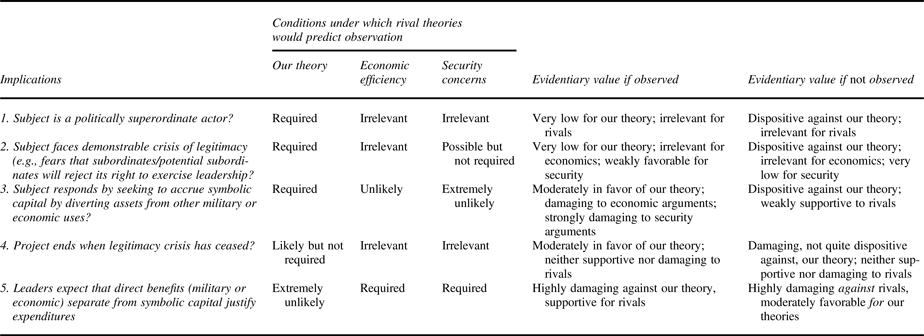 This framework integrates relevant theoretical perspectives and strands of research. Hegemonic-order theories posit that dominant actors craft political order and, in doing so, allocate status and prestige.Footnote 8 These theories imply that dominant actors will seek to legitimate their position, but they face trouble in accounting for, first, when they make exceptionally costly investments in acquiring symbolic capital and, second, the particular kinds of goods and performances that dominant actors pursue.Footnote 9 The cases here—in which dominant actors saw economically and militarily unproductive investments as appropriate responses to critical security threats—prove particularly challenging.