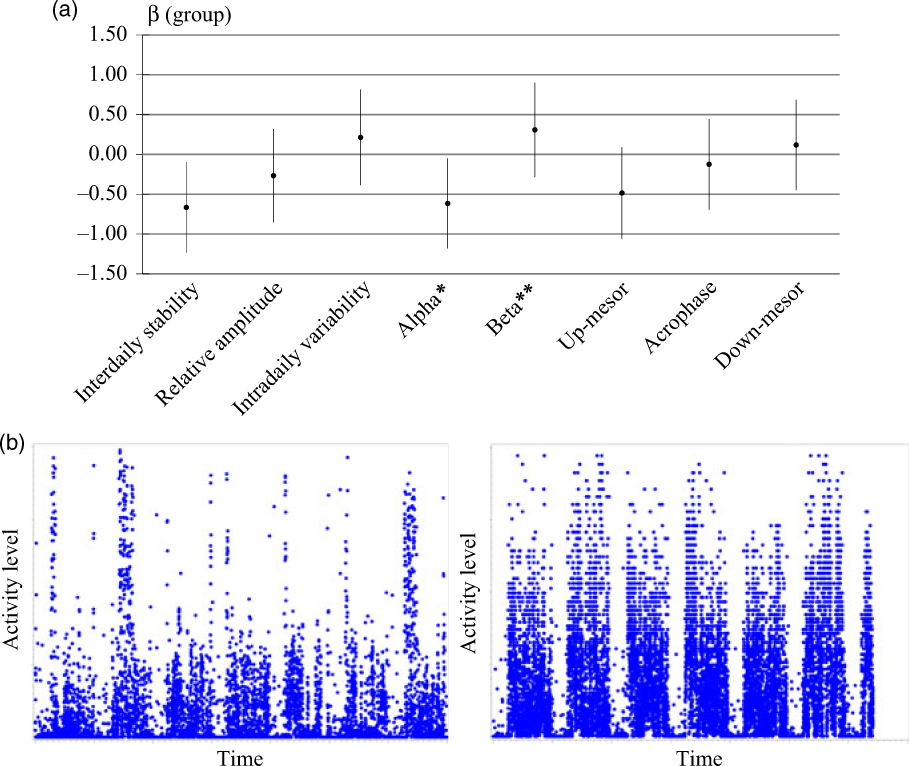 Figure 1. (a) Age-adjusted coefficients indicating group rest-activity (RAR) differences and (b) a week of recording from participants with low (left) and high (right) inter-daily stability. Note: age-adjusted coefficients (95% confidence intervals) shown with negative values indicating the RAR metric is lower in the bereaved compared to the non-bereaved sample.
