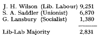 page 336 note 4 1900 Election: Electorate 17, 307; Col. Samuel A. Saddler (Unionist) 6760; Joseph H. Wilson (Liberal-Labour) 6705; Unionist Majority 55. Saddler, who had first stood for the constituency in 1878, was the owner of a large chemical works and an ex-mayor of Middlesbrough.