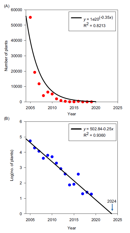 The eradication plan was initiated in 2005 at the FSRU, a year in which more than 55,000 C. benghalensis plants were detected and physically removed from organic fields or removed from fields managed under conventional agriculture practices using a combination of physical removal and the use of effective herbicides. This intensive approach was very effective in reducing the populations of this invasive species at a logarithmic rate (Figure 1A). Thus, after 3 yr, the number of detections was reduced more than 10-fold. In general, the eradication methodology resulted in a sustained and consistent rate of population decline with a trajectory to achieve eradication in 2024, or 19 yr after its initiation (Figure 1B).