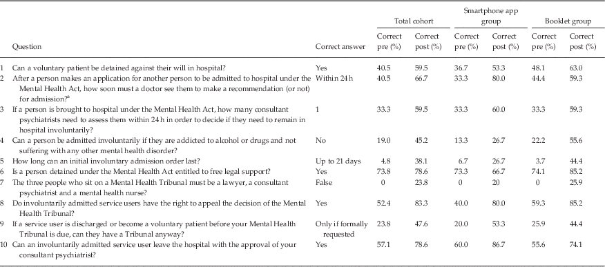 Therefore, this study aimed to determine whether a smartphone application (app) could result in an improvement in service users’ knowledge of their rights under mental health act legislation compared with a paper booklet. It was hypothesized that individuals who received the information via smartphone app would have a greater improvement in knowledge compared with those allocated to the paper booklet.