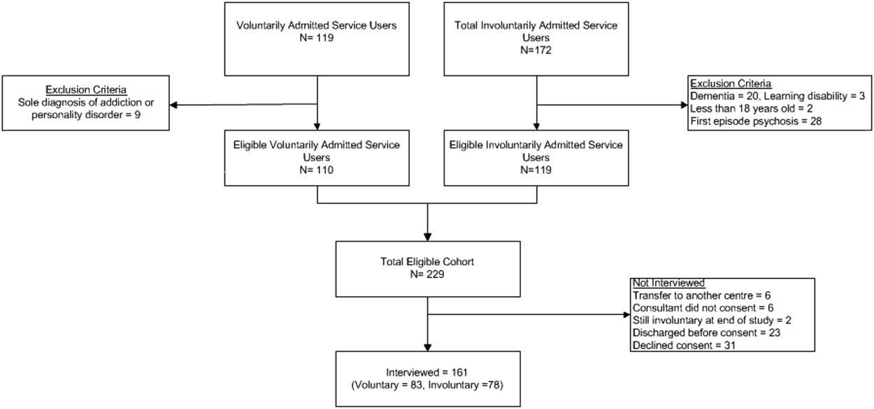 The MHA 2001 stipulates that individuals with a sole diagnosis of a personality disorder or substance misuse cannot be admitted involuntarily. Therefore, to have comparable samples, we excluded voluntarily admitted service users with either a sole diagnosis of a personality disorder or substance misuse. We also excluded individuals with dementia and intellectual disabilities; those with a first episode of psychosis were excluded because they were involved in another study protocol.