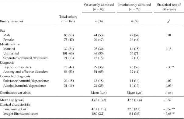 Table 1 Demographic and clinical characteristics of the total cohort and the voluntarily and involuntarily admitted service users subgroups