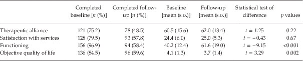 Table 3 Comparison of the therapeutic alliance, satisfaction with services, functioning and objective quality of life from baseline to follow-up