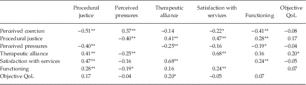 Table 4 Correlations between the experience of admission (perceived coercion, procedural justice and perceived pressures) and factors including satisfaction with services, therapeutic alliance, functioning and objective quality of life (QoL)