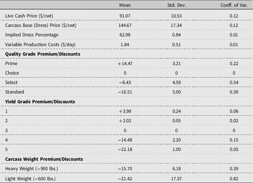 To mitigate market timing errors due to the unobservable carcass characteristics, ultrasound and genetic testing have been developed (e.g., Brethour Reference Brethour2000; DeVuyst et al. Reference DeVuyst, Bullinger, Bauer, Berg and Larson2007; Lusk Reference Lusk2007; Lusk et al., Reference Lusk, Little, Williams, Anderson and Mckinley2003; Norwood et al., Reference Norwood, Lusk and Brorsen2004; Thompson et al., Reference Thompson, DeVuyst, Brorsen and Lusk2014). These technologies have yet to be widely adopted by cattle feeders primarily due to cost, though cost minimizing random sampling techniques for genetic testing have been proposed (Thompson et al., Reference Thompson, Brorsen, DeVuyst and Lusk2017). Alternatively, nearly every feeder today has affordable access to a chute scale and radio-frequency identification (RFID) technology from which individual whole-body growth can be tracked.Footnote 4 It is well known in the beef cattle production literature that quality and yield grade carcass characteristics are correlated with live weight via carcass weight (e.g., Bruns et al. Reference Bruns, Pritchard and Boggs2004; Good et al., Reference Good, Dahl, Wearden and Weseli1961; Owens et al., Reference Owens, Gill, Secrist and Coleman1995; Streeter et al., Reference Streeter, Hutcheson, Nichols, Yates, Hodgen, VanderPol and Holland2012). Therefore, cattle feeders may be able to use live weight information to make informed marketing decisions regarding expectations of carcass value.