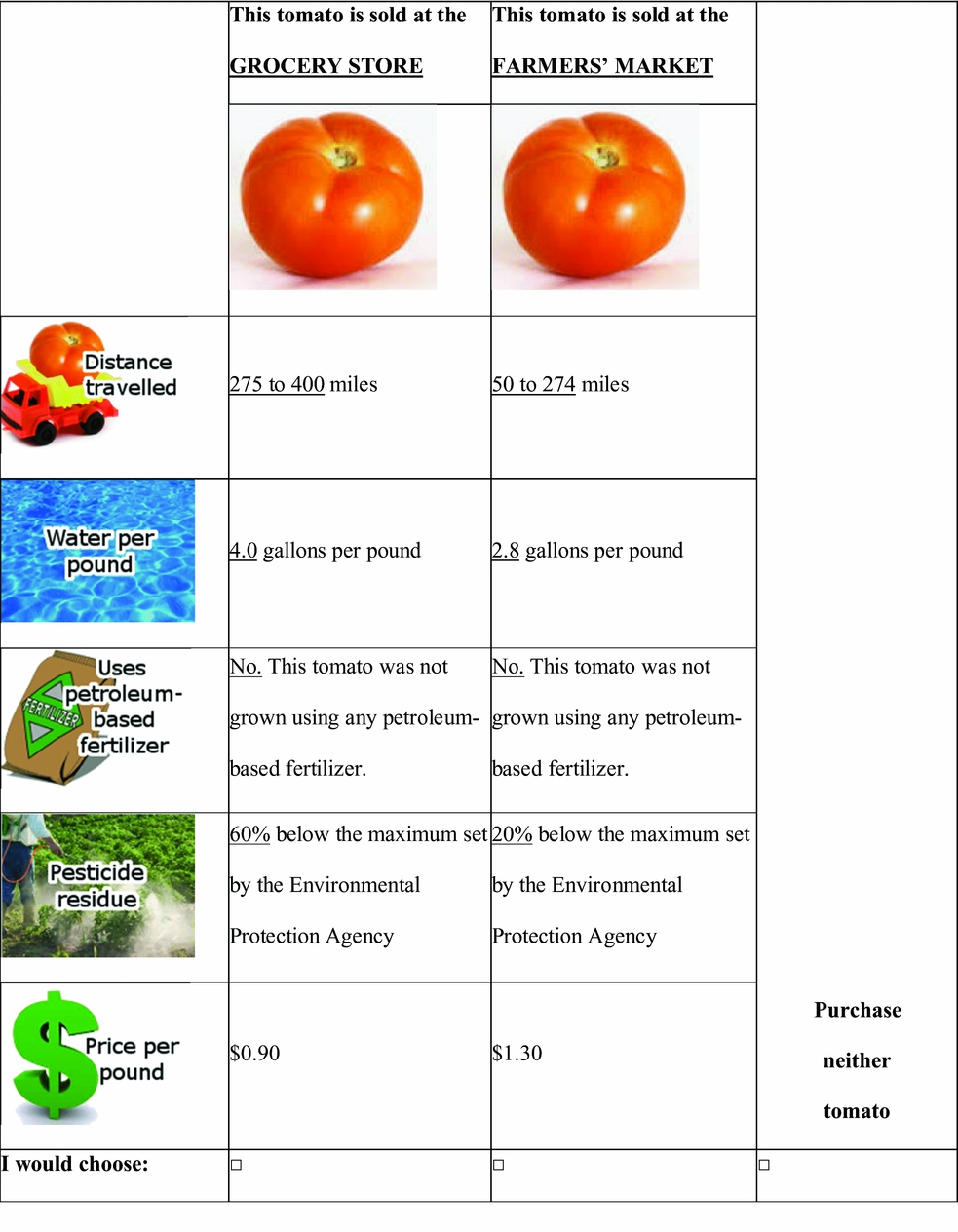 Several studies have found that consumers consider production claims such as “local,” “organic,” or “sustainable” when purchasing food items and that there is the potential for capturing price premiums through label or certification claims (e.g., Dentoni et al., Reference Dentoni, Tonsor, Calantone and Peterson2009; Dimitri and Greene, Reference Dimitri and Greene2002; Onozaka and Thilmany McFadden, Reference Onozaka and Thilmany McFadden2011; Sackett, Shupp, and Tonsor, Reference Sackett, Shupp and Tonsor2016; Zepeda and Leviten-Reid, Reference Zepeda and Leviten-Reid2004). Others have found that consumers are willing to pay more for products perceived to have positive effects on the environment specifically (e.g., Straub and Thomassin, Reference Straub and Thomassin2006; Thilmany, Bond, and Bond, Reference Thilmany, Bond and Bond2008). However, existing literature on environmental impacts of food choices has so far generally been limited to consumers’ general concern for the environment. For example, Thilmany, Bond, and Bond (Reference Thilmany, Bond and Bond2008) found that consumers who believed there was an “environmental benefit” were willing to pay more for local melons. Bougherara, Grolleau, and Mzoughi (Reference Bougherara, Grolleau and Mzoughi2009) found that “environmental considerations” played a role in consumers deciding whether to participate in a community-supported agricultural program. Straub and Thomassin (Reference Straub and Thomassin2006) found that consumers are willing to pay more for tomatoes produced using “environmental management systems.” Our study examines specific environmental impacts including how far the product traveled, the amount of nonrecycled water used to grow the product, whether the product was grown using petroleum-based fertilizer, and the amount of pesticide residue on the product.