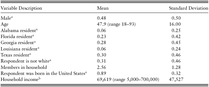 Data for the study were collected using an online consumer survey in July and August 2013 hosted by Research Now. Research Now was contracted to program, host, and implement the online survey and to recruit survey respondents. The sample included residents of Mississippi, Alabama, Georgia, Louisiana, Texas, and Florida. Research Now analysts selected a demographically representative sample, relative to state census data, of respondents aged 18 or older. Demographics of the sample are compared to those of their respective states in Table 2. The comparison indicates that the sample is fairly representative, with the exception of age, likely because of the requirement that each survey respondent be over the age of 18 and also be the primary shopper of the household. Respondents were also screened to assure that they purchase fresh tomatoes at least once per month. The number of sample observations for each state is proportional to the total population of the state itself compared to the total population of the other states. For example, the population of Alabama is approximately one-fifth the population of Texas, and in our sample, the number of respondents from Alabama is approximately one-fifth the number of respondents from Texas.