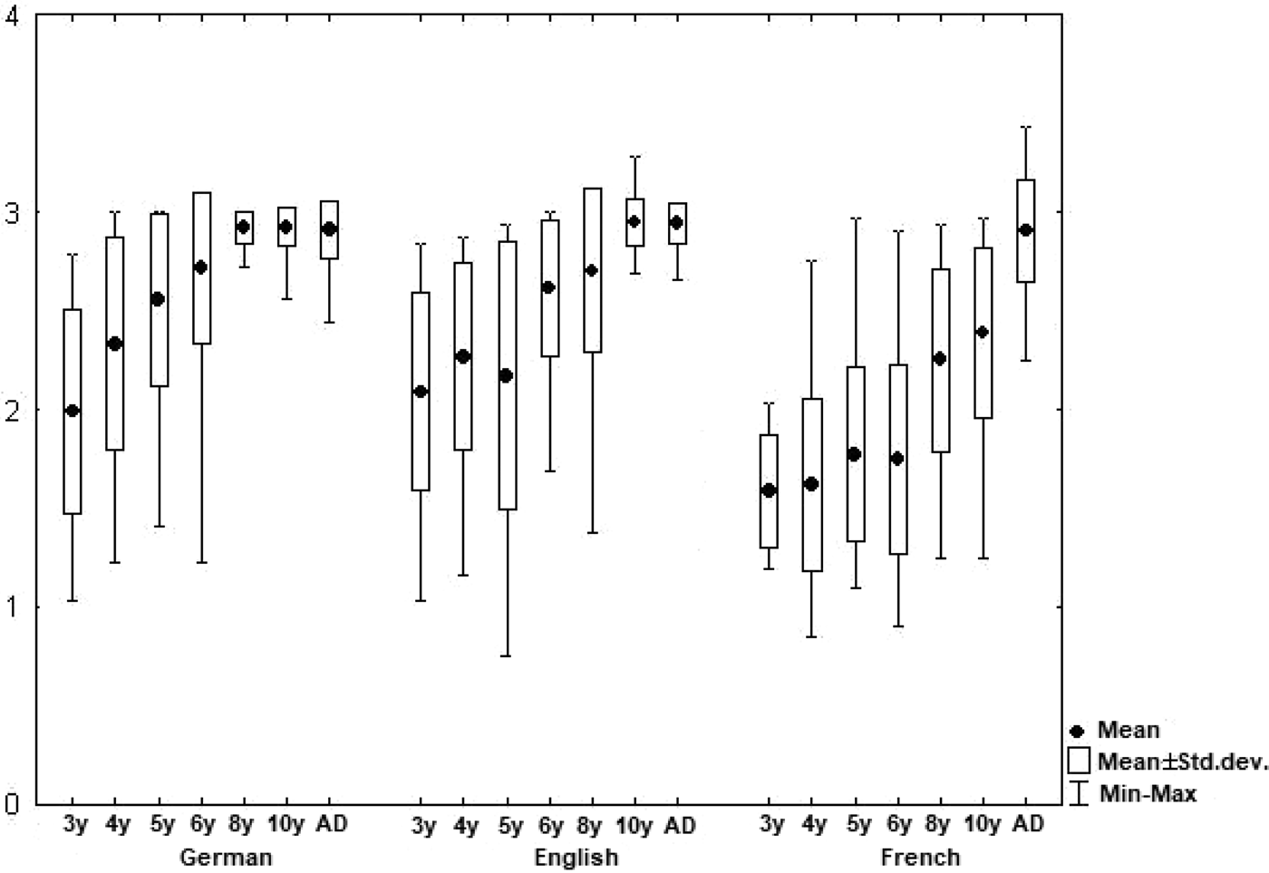 A significant age effect was also observed both overall (F1(6,447) = 56.25, p < .001, η 2 = 0.43; F2(6,168) = 922.96, p < .001) and within each language (English F1(6,149) = 15.44, p < .001, η 2 = 0.38; F2(6,168) = 365.19, p < .001; German F1(6,149) = 17.77, p < .001, η 2 = 0.42; F2(6,168) = 450.18, p < .001; French F1(6,149) = 31.33, p < .001, η 2 = 0.56; F2(6,168) = 271.39, p < .001), showing an increase in density from five years on, but no changes before that age. As predicted, language and age also interacted (F1(12,447) = 4.70, p < .001, η 2 = 0.11; F2(12,336) = 70.81, p < .001). A qualitative description of Figure 1 indicates that density did not vary across languages in the adult data, but seems to be higher in German and English than in French at all ages in the child data. Figure 1 further indicates that density appears to be higher in German than in English at ages five and eight. Finally, density increased in German up to age eight, but continued to increase thereafter in English and French.