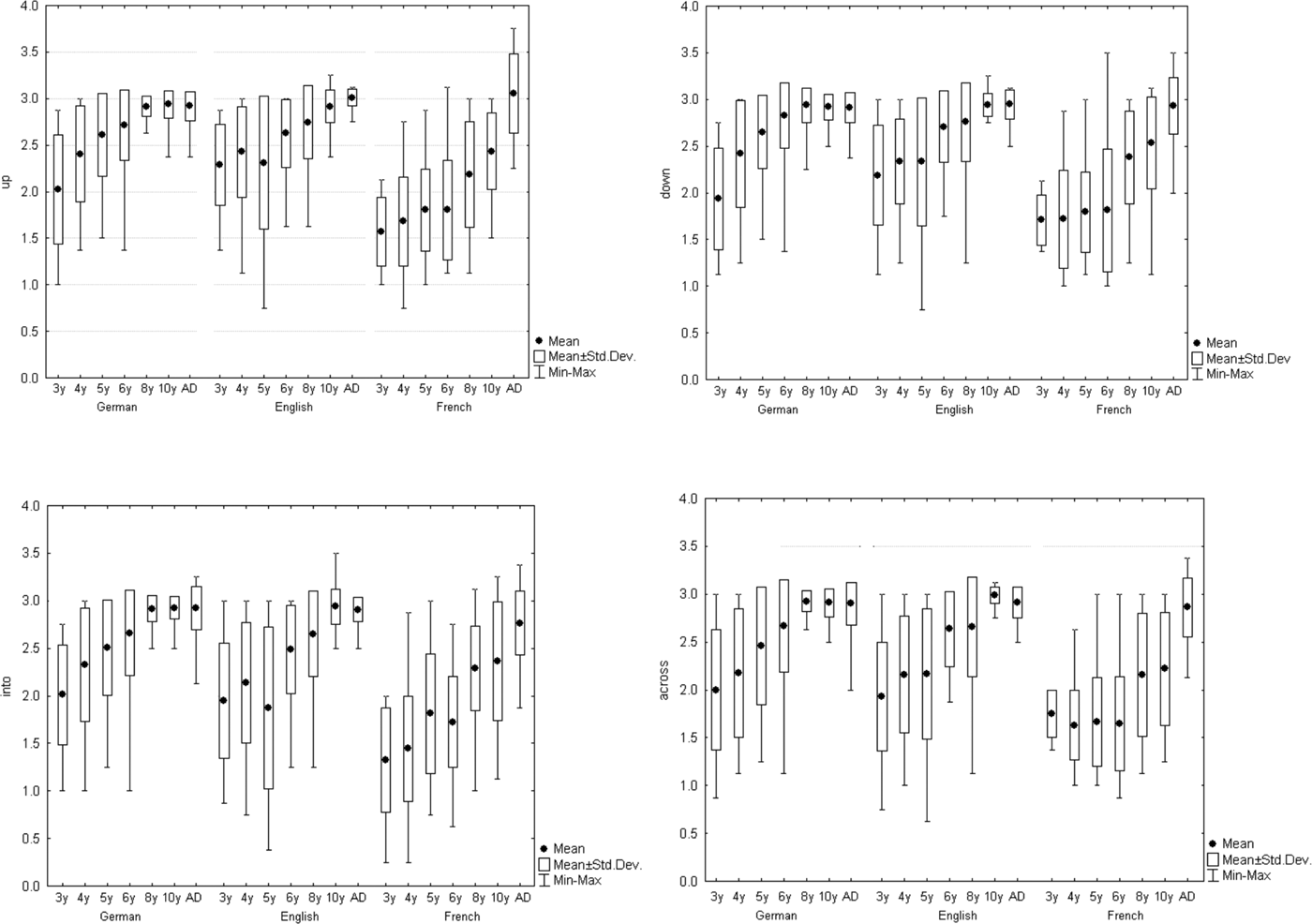 Recall that three event properties were varied in our stimuli, including especially Path in addition to several types of Manners (which were only explored here qualitatively). Our analyses focused on Path, testing the hypothesis that this feature, most essential in Talmy's typology, might impact responses. Indeed, up/down elicited denser responses than into/across in all three languages. This finding suggests that children find it more difficult to combine multiple components with boundary crossing than with vertical motion, perhaps because the former (which implies categorical changes) involves conceptually more complex events than the latter (which implies gradual changes of location). Note that Path differences occurred mainly at young ages in English and German, while they occurred at all ages in French, where devices outside the verb increased at a slower rate. Our hypothesis that the relative complexity of events might also impact response architecture was not borne out. Although significantly more TS responses were found overall with vertical motion events than with the more complex crossing events, this finding was not replicated for any of the individual languages, indicating that this effect corresponded only to a tendency.