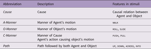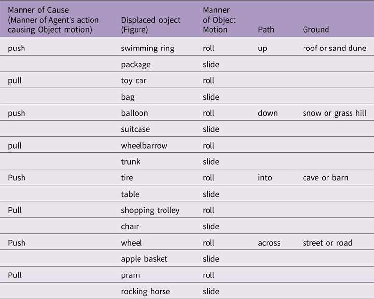 Motion expression has been at the center of much current (psycho)linguistic research (Slobin, Reference Slobin, Gumperz and Levinson1996, Reference Slobin, Strömqvist and Verhoeven2004; Talmy, Reference Talmy2000). Cross-linguistic diversity in this domain has led to studies claiming that language impacts how speakers express motion and how they conceptualize motion in discourse. Most studies have focused either on voluntary motion or on placement events but less is known about other types of motion.