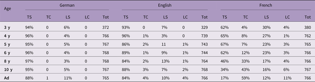 Table 3 provides further qualitative information about the types of response architecture that were found. A quick glance at Table 3 shows that architecture clearly varied across languages. Not only were TS responses most frequent in English and German at all ages (cf. results reported above), but this qualitative look also shows that TC responses were more frequent in French and increasingly so with age. Most variation in response architecture occurred in French, both within and across ages. TS responses did not vary with age in German, while they initially increased with age in English until five years, but not thereafter. As regards French responses, they involved both TS and LS, mostly among young children, but thereafter TS responses decreased from six years on until adulthood, due to a clear increase in TC responses.