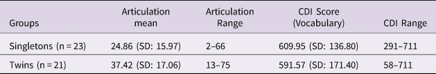 Twins are observed to achieve the milestones of language development at a slower pace when compared to their singleton peers (Conway, Lytton & Psych, Reference Conway, Lytton and Psych1980; Mogford, Reference Mogford, Bishop and Mogford1993; Rutter, Thorpe, Greenwood, Northstone & Golding, Reference Rutter, Thorpe, Greenwood, Northstone and Golding2003 among others). They speak in shorter sentences, and have a smaller lexicon size as well as an overall less complex language (Conway et al., Reference Conway, Lytton and Psych1980; Hay, Prior, Collett & Williams, Reference Hay, Prior, Collett and Williams1987; Mogford, Reference Mogford, Bishop and Mogford1993; Gücüyener, Arhan, Soysal, Ergenekon, Turan, Onal, Koç, Turkyilmaz & Atalay, Reference Gücüyener, Arhan, Soysal, Ergenekon, Turan, Onal, Koç, Turkyilmaz and Atalay2011; Rice, Zubrick, Taylor, Gayán & Bontempo, Reference Rice, Zubrick, Taylor, Gayán and Bontempo2014). They are also reported to have a greater tendency for speech disorders (Dodd & McEvoy, Reference Dodd and McEvoy1994; Lewis & Thompson, Reference Lewis and Thompson1992) and produce a lesser amount and diversity of gestures (Ozturk, Pınar, Ketrez & Özçalışkan, Reference Ozturk, Pınar, Ketrez and Özçalışkan2021). Differences observed in twins’ language devlopment are attributed to biomedical reasons such as low birth weight and preterm birth (Stromswold, Reference Stromswold2006) and/or psychosocial or environmental disadvantages (e.g., the amount and quality of input language) that are associated with twinning (Lytton, Conway & Suave, Reference Lytton, Conway and Suave1977; Stafford, Reference Stafford1987). Different subareas of language develop interdependently. Vocabulary and articulation are such interdependent areas (e.g., Smith, McGregor & Demille, Reference Smith, McGregor and Demille2006) but their development by different populations of children acquiring typologically different languages have not been studied. This study aims to contribute to the discussion of language development of twins in comparison to singletons with consonant articulation and vocabulary data from Turkish, a language that has not been explored from this perspective before.
