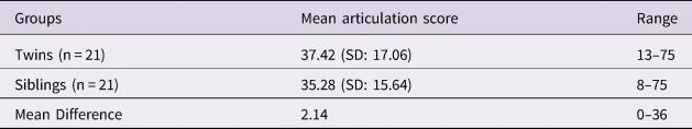 Table 3 shows the mean articulation scores of the twins and their siblings along with the mean difference and the range of scores. The comparison showed that the articulation scores of the siblings were similar to that of their co-twins with a difference ranging from 0 to 36 errors (mean difference of 2.14 errors). The lowest articulation scores in both groups (13 in twins and 8 in siblings) belonged to the same twin dyad. The two highest articulation scores (75 and 66), as well, belonged to the same twin dyads (75–75 in one dyad, and 75–66 in another one). Three twins had the same articulation scores as that of their siblings. The difference between the dyads, when there is any, ranged from 1-to-36 and in half of these dyads, the twins had higher scores than their siblings.
