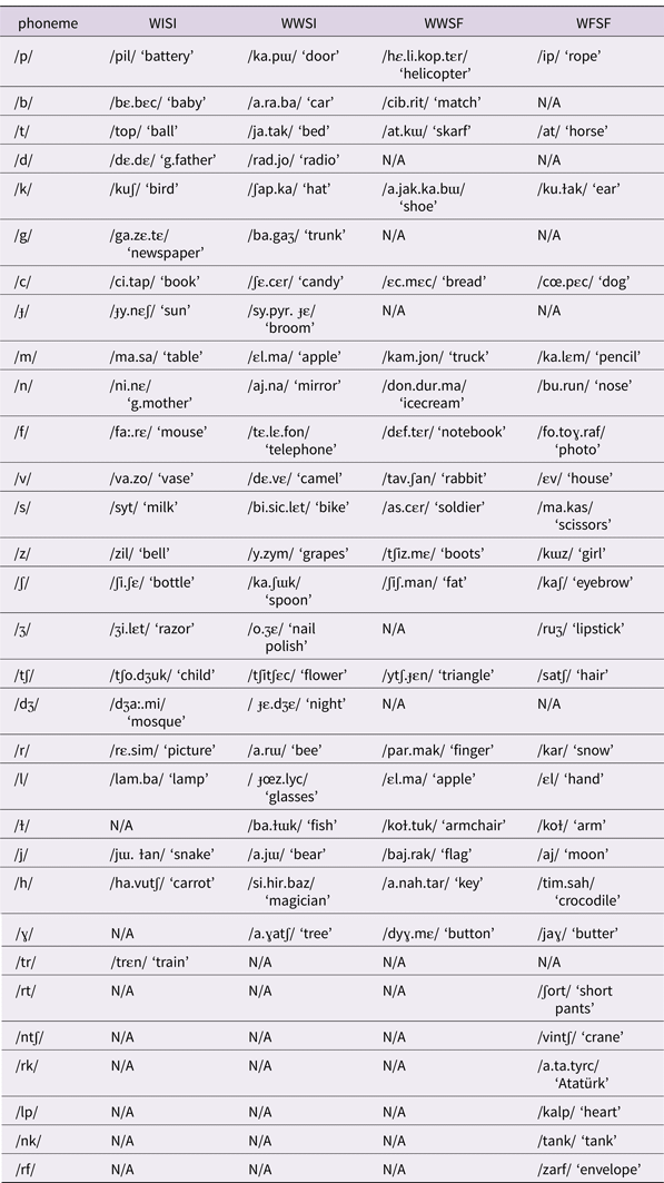 Test items that have consonant phonemes and consonant clusters in word initial, syllable initial (WISI), withinword, syllable intial (WWSI), withinword, syllable final (WWSF) and word final, syllable final (WFSF) positions (Topbaş, Reference Topbaş2006a).