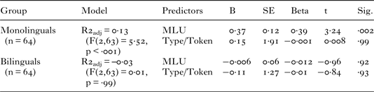 Table 4. Summary of linear regression analyses, separately for bilingual and monolingual groups, of micro-structural variables predicting Macro-structural Level (total number of elements)
