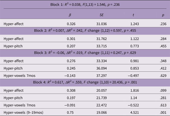 As can be seen in Tables 5 and 6, only the fourth block of each model, when the hyper-vowel scores from 9 months onward were included, predicted a significant amount of variance in expressive vocabulary scores (51.9% for the 15-months vocabulary regression analysis and 55.9% for the 19-months vocabulary regression analysis). As expected, neither overall hyper-pitch nor overall hyper-affect predicted vocabulary, but unexpectedly, neither did hyper-vowel scores at 7 months.