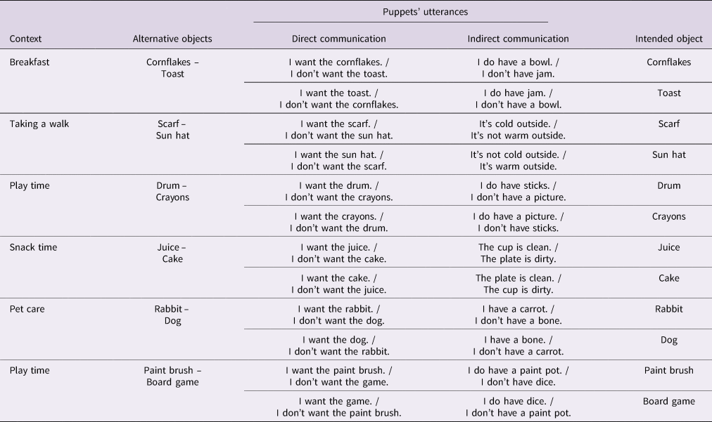 The puppet indirectly hinted at her goal, saying for instance “I have/do not have a bowl”, thus not mentioning any of the actual objects the child had to choose from. Therefore, the children had to infer the puppet's intended object.