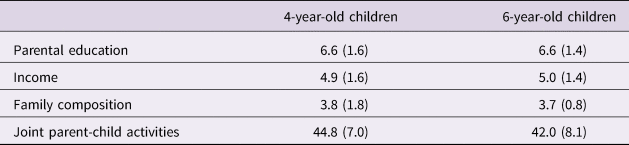 Moreover, we asked parents about their family's composition (i.e., how many persons lived in their household) and how often they performed joint activities with the child based on a questionnaire on preschool-aged children's activities in the family (German AKFRA, see Roßbach & Leal, Reference Roßbach and Leal1993; see also the documentation of instruments for the national assessment of education in early childhood (NUBBEK) in Eckhardt et al., Reference Eckhardt, Egert, Beckh, Berkic, Kalicki and Quehenberger2011). Activities comprised for instance reading books, singing, playing games, sports, drawing pictures (total of 13 activities) and parents answered on a 6-point Likert-scale ranging from 0 (never) to 5 (daily).