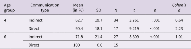 A Univariate ANOVA with children's mean percentage of trials in which they chose the correct object in the communication task as dependent and communication type (direct, indirect) and age group (4, 6) as independent variables revealed significant main effects of communication type (F(1) = 46.912, p < .001, η2 = .348) and age group (F(1) = 5.261, p = .024, η2 = .056). That is, children responded more correctly after hearing direct utterances compared to indirect ones (direct: M = 94.7, SD = 14.1; indirect: M = 66.7, SD = 20.8). 6-year-old children responded more correctly than 4-year-old children (6-year-olds: M = 81.4, SD = 21.9; 4-year-olds: M = 71.9, SD = 23.1). No interaction was found.