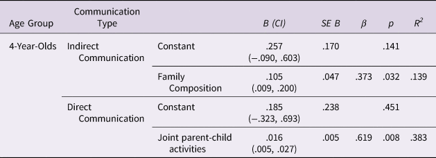 For 4-year-olds’ direct communication, the regression model revealed only a significant effect of the sum score for joint activities on children's object-choice performance, explaining 38.3% of the data (see Table 4, ps > .45 for the other predictors).