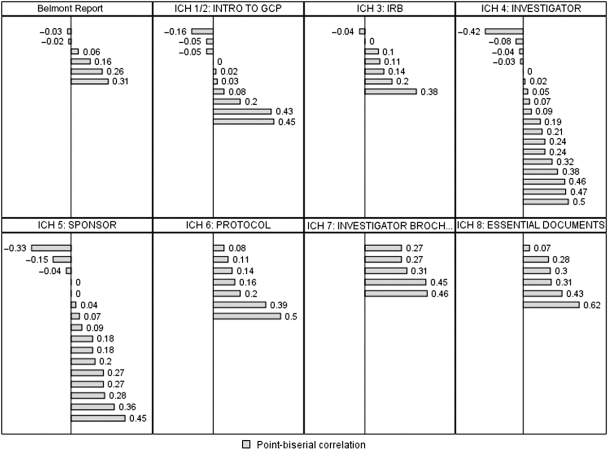 Fig. 2. Point biserial correlations by ICH domain. Note: GCP, Good clinical practice guidelines; ICH, International Conference on Harmonization; IRB, Institutional Review Board; Intro, introduction.
