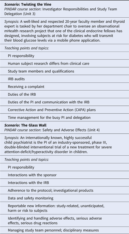 Once the course materials were crafted, the developers proceeded to phase two and reviewed and revised their content first with Faculty C and D, and then with senior-level research faculty and representatives of our institutional human research regulatory affairs, which includes IRB operations and RRS. As all of our PI researchers are required to complete the Collaborative IRB Training Initiative program (CITI Program, Miami, FL, citiprogram.org) and to take the refresher course every 3 years, the program developers made a concerted effort to not introduce duplicative information and to instead provide each PI with relevant, actionable information, relevant to the “real world” of research studies [Reference Holbein10,Reference Arango11]. The final version of the materials that make up the PINDAR program includes an original 77 slide presentation and presenter study notes, original vignette flash-card exercises, four original mini-cases (relating to the medical care of trial subjects, adequacy of resources, compliance with the protocol, investigational products, records, and reports), two original detailed case scenarios, based on actual events (Twisting the Vine and The Glass Wall), portions of the ICH-6 text [6], two published journal articles (assigned as pre-course reading) [Reference Seife12,Reference Cohen13], and a relevant publicly available FDA-warning letter [Reference O’Reilly14,Reference Shetty and Saiyed15]. Although FDA-warning letters are not specifically indicative of the quality of research performed at medical research institutions with Clinical and Translational Science Awards (CTSA), they do highlight the types of deficiencies most commonly encountered nationally. The letter selected for PINDAR participants’ review and in-person discussion provides details of GCP non-compliance for which a PI was held accountable and serves as an illustrative “real-world” occurrence. Presenter slides include text cited directly from the ICH E6 GCP guidelines when relevant. Table 2 provides an overview of the two detailed case scenarios’ teaching points. All the educational materials were designed to foster interactions, stimulate discussion and active participation using realistic scenarios, open-ended questions, small group breakouts, and adult learning principles [Reference Taylor and Hamdy16]. We also crafted eight questions for participants designed to anonymously provide direct immediate feedback to the course developers and the PINDAR faculty at the completion of each session along with a 3-month post-course follow-up six question survey to help us gauge the perceived longer-term usefulness of participation in the PINDAR program.