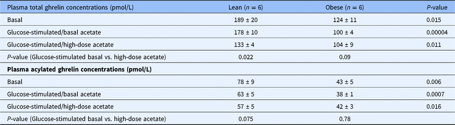 Table 1. Plasma concentrations of total and acylated ghrelin in the fasting state and during hyperglycemic conditions with a basal (0.7 μmol/Kg-min) and with a high-dose infusion of acetate (14 μmol/Kg-min) in healthy lean (n = 6) and obese (n = 6) individuals