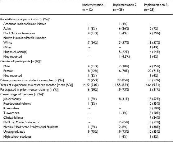 A total of 70 mentors participated in the training across 3 implementations; 64 mentors (91%) provided consent for their data to be included in this research across the 3 pilot test implementations. Prior mentoring experience and demographic information for participants at each implementation site are provided in Table 2.