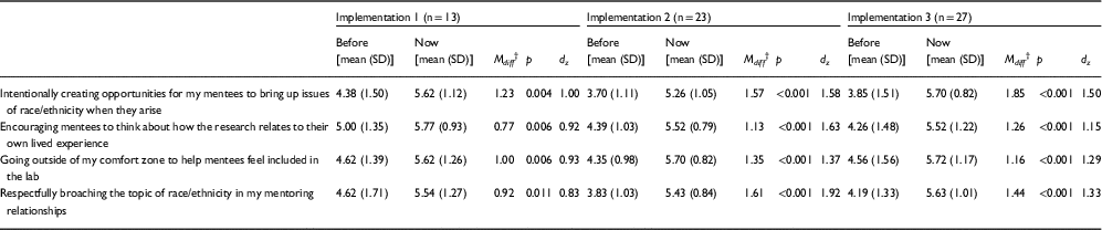 Open-ended responses from participating mentors reflected the overall utility of the training. Some mentors commented on their own revelations regarding the importance of addressing cultural diversity in the research mentoring relationship. One mentor from Implementation 1 noted: “This topic is important and worth the time it takes in meeting (e.g., building in time in meeting for discussion). It [culturally aware mentoring] is my ethical responsibility if I am going to be a mentor. Loved talking to my peers about this!” Another mentor from Implementation 3 shared that “I hadn’t thought about how these practices were important in inviting productivity in a lab.” A mentor from Implementation 2 expressed appreciation for the research findings shared in the training: “I will continue to advocate for my students and thanks to you I have research to support what I have [experienced].”