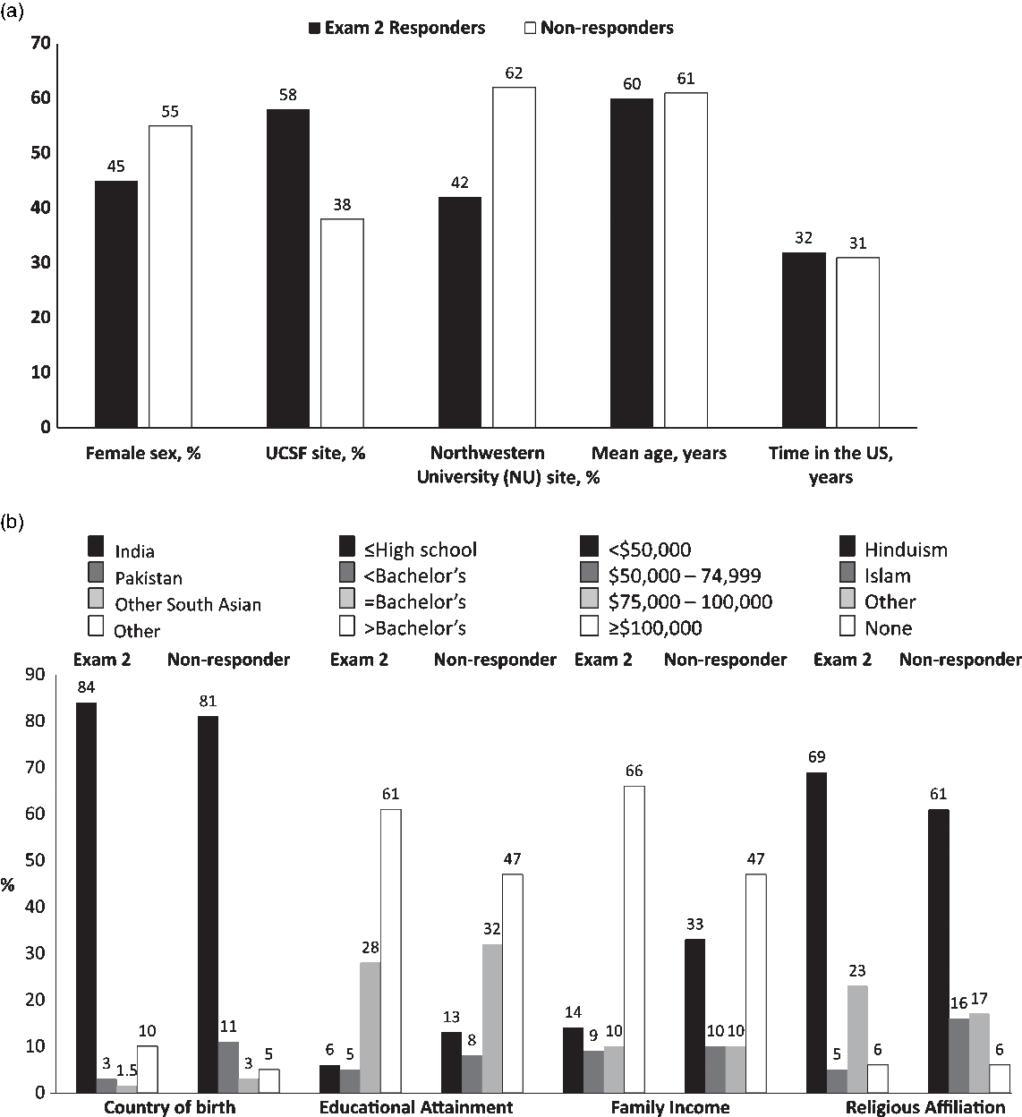 After a median 4.8 years of follow-up, a total of 749 (83%) of the surviving MASALA cohort (n = 900) participated in Exam 2 with higher retention at the UCSF site compared to NU (88% vs 76%). Another 258 participants were recruited in the second enrollment wave (called Exam 1A), with 55% recruited from the greater Chicago area and 45% from the San Francisco Bay area. Table 1 shows the demographic characteristics of the MASALA study cohort at each exam and the new wave of enrollees. The new enrollees in Exam 1A were older than Exam 2 participants, had lived in the USA for fewer years, were more likely to be from Pakistan and Sri Lanka, and had lower educational attainment compared to existing participants. Fig. 2 compares the participants who completed Exam 2 with the surviving cohort participants who did not return for Exam 2. Compared to participants who completed Exam 2, non-responders were more likely to be women, Pakistanis, Muslim, and have lower educational attainment.