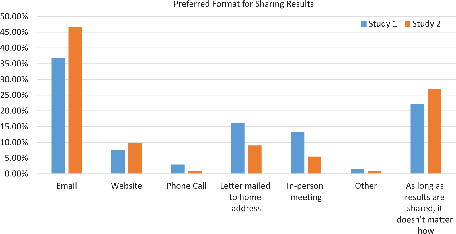 Those who indicated that researchers should share results were asked the best format for sharing study results with participants. Thirty-seven percent (n = 25; survey 1) and 47% (n = 52; survey 2) preferred email, while 22% (n = 15) and 27% (n = 30), respectively, indicated that, as long as the results are shared, it does not matter how they are shared. The complete distribution is shown in Fig. 1.