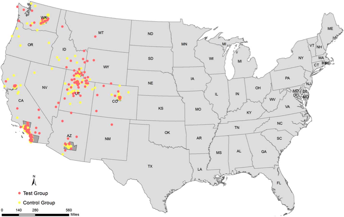 Fig. 1 Distribution of the participants initially assigned to the western region showing the control and test group. To protect the confidentiality of the participants, the data has been masked by random perturbation within a circle. This technique randomly moved the participant in any direction within a 100-mile radius.