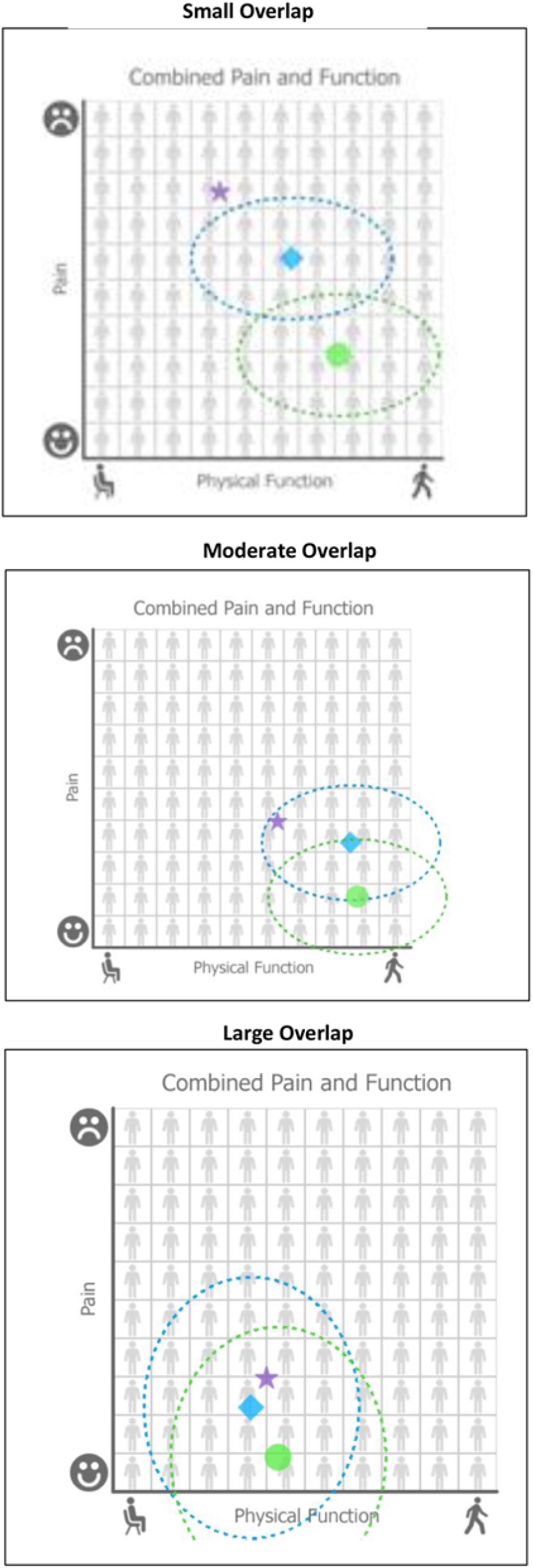 Mathematical equipoise was defined for KOMET as when the pain and functioning outcome predictions with nonsurgical care and TKR are close, i.e., within, or overlapping, each other’s “uncertainty circle.” In Fig. 1, this is illustrated by hypothetical example graphs with small, moderate, and large amounts of “uncertainty circle” overlap. The uncertainty circle is defined by the shaded area extending around each of the point estimates and is derived from the 95% prediction intervals associated with the predictions for the two outcomes. The blue diamond represents the outcome prediction point estimate for nonsurgical care; the green circle represents the point estimate for TKR. The points are plotted on an X–Y plane with function on the x-axis and pain on the y-axis. The large shaded blue and green overlapping circles around the 95% prediction intervals of the pain and function point estimates and represent the uncertainty associated with the individual predictions. We computed the mathematical distance between the nonsurgical and TKR predictions as the distance between the two coordinates on the pain and function graph using the following equation: