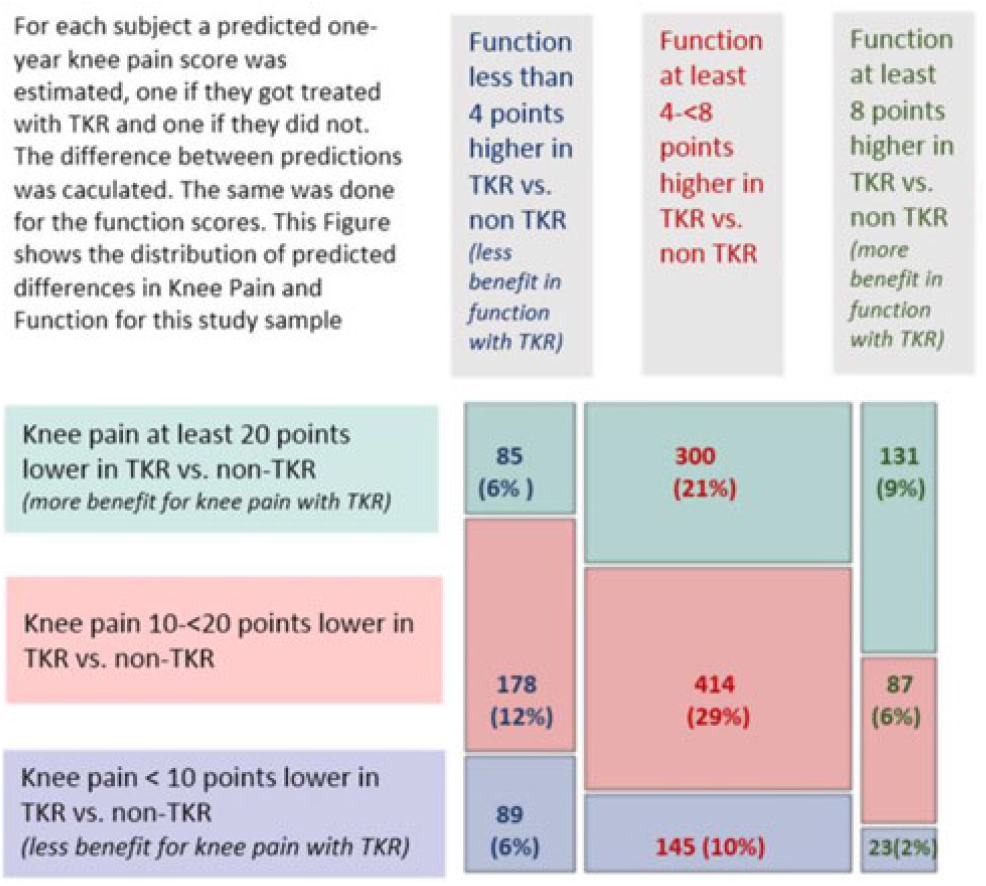 Fig. 2. Mosaic plot showing distribution of predicted differences (TKR vs. non-TKR) for 1-year knee pain and SF-12 physical function in pooled data (N = 1,452 subjects).