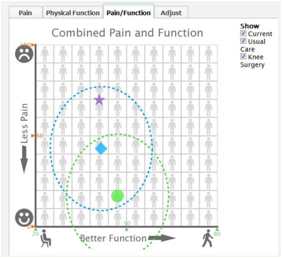 Decision Support Software Development. There were two KOMET software development tasks: one for the analytics and another for the user interface. Analytics development included implementing the predictive models as reusable, multiplatform software components to generate the current and 1-year-predicted pain and function outcomes for nonsurgical and surgical treatments. The analytics software also calculated the respective 95% confidence intervals around each prediction as the basis for considering the degree of overlap that would suggest near equivalence or patient-specific equipoise. User interface development included creating a web browser-based questionnaire interface to collect patient demographics, items for computing the WOMAC pain score, the SF-12 physical functioning scale, and comorbidities. Together, the analytics and user interface components included methods for data retention and presentation of the predicted outcome results.