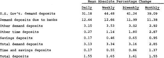 8 Dewald and Dreese, “Bank Behavior,” p. 872; Struble and Wilkerson, “Bank Size,” pp. 6–9; Chairnoff, “Deposit Variability,” pp. 10–15. Differences in variability in different categories of deposits are evident from the data below for all 53 large member commercial banks which in 1969 reported balance sheet information weekly to the Federal Reserve Bank of Chicago. The data are described in greater detail later in the study.