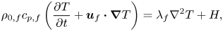 \begin{align} (1-\phi)\rho_{0,f}\left(\frac{\partial \boldsymbol{u}_{f}}{\partial t}+ \boldsymbol{u}_{f}\boldsymbol{\cdot}\boldsymbol{\nabla} \boldsymbol{u}_{f}\right)&={-}(1-\phi)\boldsymbol{\nabla} P+(1-\phi) \eta_{f} \nabla^{2} \boldsymbol{u}_{f}, \nonumber\\ &\quad -(1-\phi)\rho_{0,f}\alpha_{f}\theta\boldsymbol{g}-\boldsymbol{f}, \end{align}