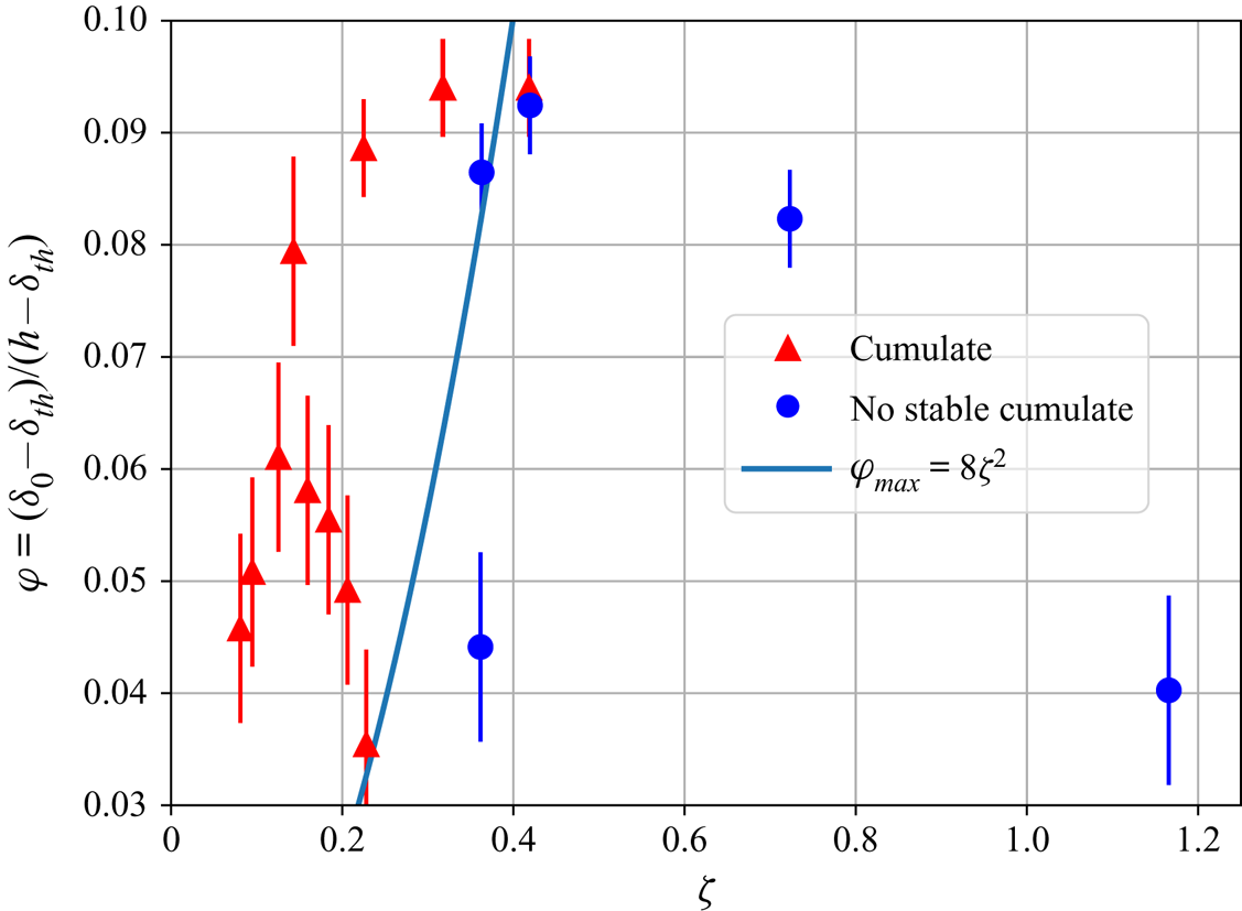 $\epsilon = 4\pm 3\,\%$ in our experiments. This estimate is slightly higher than the values reported in the literature but still consistent with them (Solomatov et al. Reference Solomatov, Olson and Stevenson1993; Lavorel & Le Bars Reference Lavorel and Le Bars2009). However, the main purpose of this physical argument is to show how to reconcile Solomatov's ad hoc expression with the complete physical framework that governs the two-phase flow and to verify it qualitatively. Experiments where the bulk concentration of beads is precisely measured are required to corroborate quantitatively this reasoning.